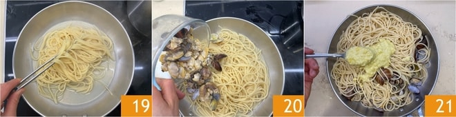 Escurrid allí los espaguetis al dente y completad la cocción 19. Al final, añadid las almejas 20 y el pesto de limón 21.