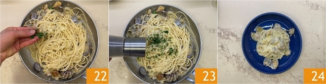 Aromatizad con perejil picado 22 y pimienta molida 23. Servid bien calientes vuestros espaguetis con pesto de limón y almejas 24.