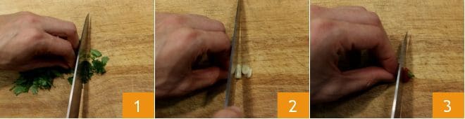 Para preparar los espaguetis con alubias y mejillones, comenzad a preparar el picadillo para el sofrito. Laváis y picáis un ramillete de perejil 1, después peláis el diente de ajo y lo picáis 2, luego cortáis el pimiento para eliminar la parte verde 3 y lo cortáis en rodajas finas.