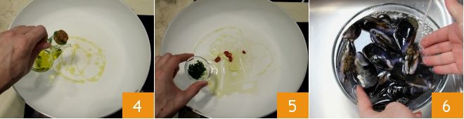 En una sartén grande, vertéis un chorro de aceite 4, luego añadís el ajo, el pimiento y parte del perejil picado 5 y sofreís todo a fuego muy bajo, removiendo de vez en cuando. Mientras tanto, pasad a Cómo limpiar y abrir los mejillones; Enjuagadlos bajo agua corriente 6.