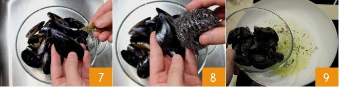 Eliminad el biso, es decir, la barba de los mejillones 7, y frotad la superficie de cada mejillón con un estropajo 8 o raspadlos con la hoja de un cuchillo. Enjuagadlos de nuevo y verted los mejillones en la sartén con el sofrito que habíais preparado 9.