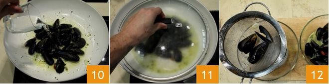 Vertéis el vino blanco 10, dejáis evaporar durante unos instantes el vino y luego cubrís los mejillones con una tapa 11; se necesitarán muy pocos minutos para que los mejillones se abran. En este punto, apagad el fuego, filtrad los mejillones recogiendo el fondo de cocción en un bol 12 y descochadlos colocando los frutos en el bol con el líquido.