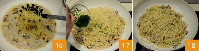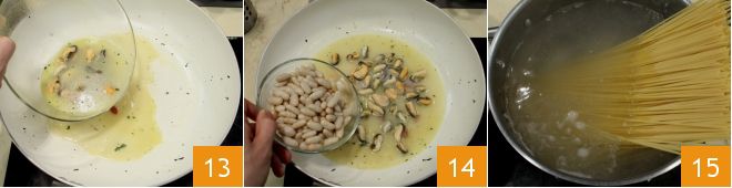 Ahora retomad la sartén en la que habíais abierto los mejillones y verted los frutos con el líquido de cocción 13. Mezclad, cocinad durante unos minutos y luego añadid las alubias cannellini cocidas 14. Salpimientad al gusto y cocinad durante 5-10 minutos hasta que las alubias se hayan ablandado y hayan creado una suave crema. Mientras tanto, en una olla grande, llevad el agua a ebullición, saláis y cocinad los espaguetis 15 durante 5 minutos o hasta que estén al dente.