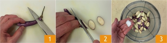 Para preparar los espaguetis con berenjenas, pecorino y mejillones, comienza con la berenjena japonesa: córtala en los extremos 1 y córtala en rodajas finas 2. Transfiere las rodajas de berenjena a un colador, sal 3 y deja que escurran durante al menos una hora.