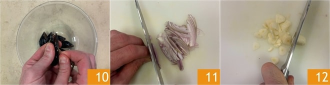 Mientras tanto, limpia los mejillones quitando el biso y las impurezas 10. Limpia y corta la chalota 11 y el otro diente de ajo 12.