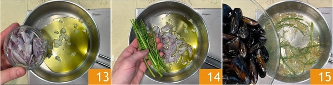 Pon la chalota y el ajo en una sartén con un chorrito de aceite 13, añade los tallos de perejil 14 y deja que se sazone, luego añade los mejillones 15.