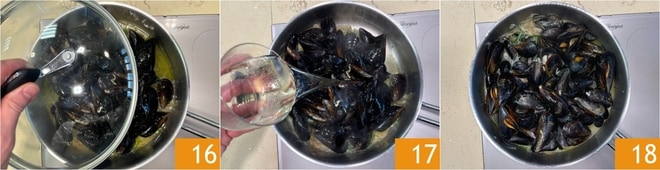 Tapa con una tapa durante 30 segundos 16, luego añade el vino blanco 17 y espera a que se abran 18.