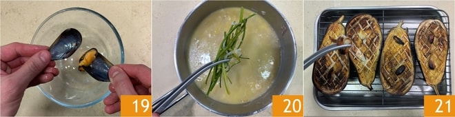 Retira los mejillones y quítales las conchas 19. Elimina los tallos del perejil 20 y reserva el líquido de cocción. En este punto las berenjenas estarán cocidas, así que sácalas del horno y elimina el ajo 21.