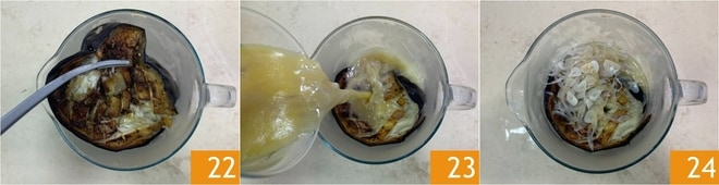 Transfiere las berenjenas a un vaso 22, luego añade el líquido de cocción de los mejillones 23 junto con el ajo y la chalota 24.
