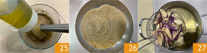 Tritura con una batidora de inmersión mientras viertes el aceite en hilo 25 hasta obtener una crema lisa y homogénea. Vuelve a poner la crema en la sartén 26 y mientras tanto lleva a ebullición una olla con agua salada. Pasado el tiempo de escurrido de la berenjena japonesa, enjuaga rápidamente y fríe en aceite de semillas a 140° 27.