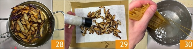Cuando estén bien doradas, escúrrelas 28 y transfiérelas a papel absorbente, luego sala 29. Cocina los espaguetis durante un par de minutos menos del tiempo indicado en el paquete 30.