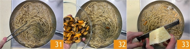 Escurre la pasta y termina de cocinarla en la sartén con la crema de berenjenas 31. Con el fuego apagado, añade los mejillones 32 y el pecorino rallado 33. Mezcla bien para amalgamar todo e emplata.