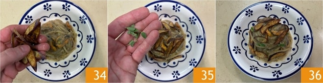 Completa el plato con las berenjenas fritas 34 y algunas hojitas de mejorana 35. ¡Tus espaguetis con berenjenas, pecorino y mejillones están listos para ser servidos 36!