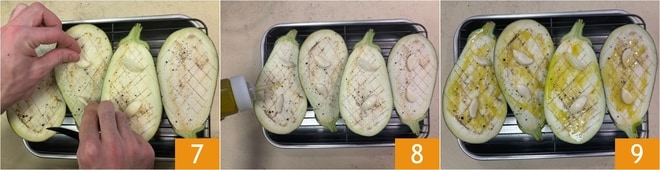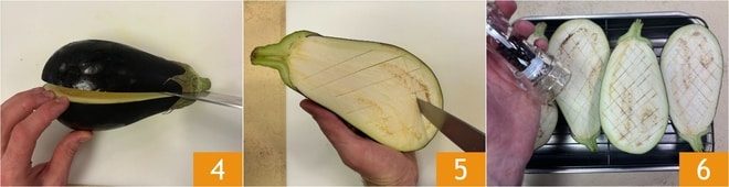 Ahora toma la berenjena morada y la berenjena zebrata, divídelas a la mitad 4 y haz cortes en la pulpa en forma de cuadrícula 5. Colócalas en una bandeja con la parte cortada hacia arriba y sazona con sal y pimienta 6.