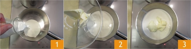 Para preparar los spaghettoni con fonduta de scimudin, lo primero que debéis hacer es poner una olla grande con agua salada al fuego, que servirá para cocinar la pasta. Pasemos ahora a la fonduta: verted en un cazo la nata 1 y la mantequilla 2. Calentar hasta alcanzar el punto de ebullición 3.