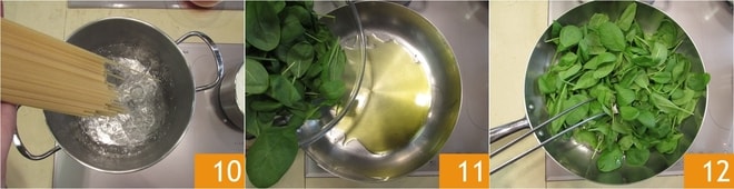 Echad los spaghettoni en el agua que habrá alcanzado el punto de ebullición 10. Mientras tanto, en una sartén caliente, verted un chorrito de aceite y las espinacas 11. Salteadlas durante unos minutos, sin dejarlas marchitar completamente 12.