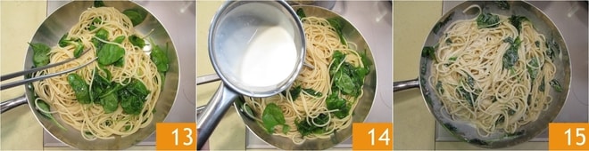 Cuando los espaguetis estén al dente, escurridlos y trasladadlos directamente a la sartén con las espinacas 13. Verted también la fonduta 14 y saltead los espaguetis 15.