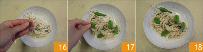Ahora emplatad: colocad los spaghettoni en un plato. Añadid un poco de la fonduta restante en el fondo de la sartén, espolvoread con la pesteda 16 y añadid algunas espinacas más 17. Los spaghettoni con fonduta de scimudin están listos para servirse 18. ¡Disfrutadlos enseguida!