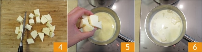 Mientras tanto, cortad el queso en cubos 4. Tan pronto como la nata haya alcanzado el punto de ebullición, apagad el fuego y dejad bajar la temperatura durante aproximadamente 1 minuto. Añadid el scimudin a la nata 5 y dejad reposar unos minutos 6. Es importante dejar bajar la temperatura de la nata para evitar una nueva caseificación del queso.