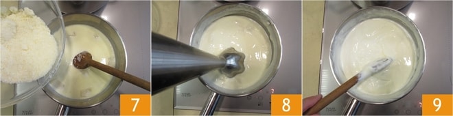 Añadid también el Parmigiano rallado 7 y batid todo con una batidora de inmersión 8 para obtener una crema homogénea y aterciopelada.