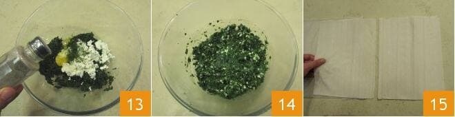 Pimentad 13 y mezclad para integrar bien el compuesto 14. Precalentad el horno en modo estático a 180°. Tomad la masa filo y separadla de manera que obtengáis dos hojas compuestas por 3 capas de masa cada una 15.