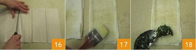Dividid cada una de estas hojas en 4 tiras de aproximadamente 10 cm de ancho que tendrán forma de rectángulo 16. Derretid la mantequilla en un cazo y pincelad la superficie de cada rectángulo con la mantequilla derretida 17. Tomad una cucharada del compuesto de espinacas y ponedla en la base de uno de los rectángulos 18,
