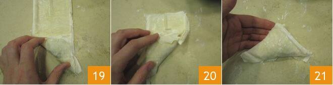 luego dobláis la masa cubriendo el relleno y haciendo coincidir la base con uno de los lados para formar un triángulo 19; continuad doblando la masa de esta manera hasta llegar al final del rectángulo 20. Presionad suavemente para sellar el paquetito 21 y colocadlos poco a poco en una bandeja forrada con papel de horno, con la apertura hacia abajo.