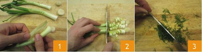 Para preparar los spanakopitakia, lo primero que tenéis que hacer es limpiar las verduras: lavad los cebolletas, cortad la base, eliminad la capa más externa 1 y cortadlas en rodajas 2. Luego picad finamente el eneldo 3 y lavad las espinacas bajo el agua corriente.