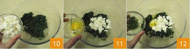 Verted las espinacas picadas en un bol, añadid la feta desmenuzada a mano 10, un huevo 11 y el eneldo picado 12.