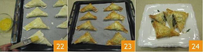Pincelad los paquetitos con el huevo batido 22 y hornead en horno estático a 180° durante unos 20 minutos, hasta que estén bien dorados 23. ¡Vuestros spanakopitakia están listos para ser disfrutados 24!