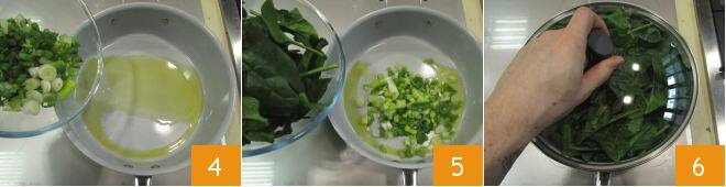 Calentad el aceite en una sartén, añadid las cebolletas 4 y las espinacas 5, cubrid con una tapa 6 y cocinad a fuego medio durante 10 minutos.