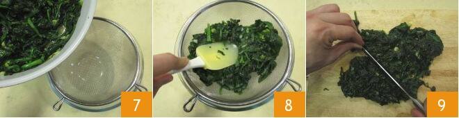 Cuando las espinacas estén cocidas, transferidlas a un colador colocado sobre un bol 7 y presionad con una espátula para que liberen el agua en exceso 8. En este punto, colocad las espinacas sobre una tabla de cortar y picadlas finamente con un cuchillo 9.