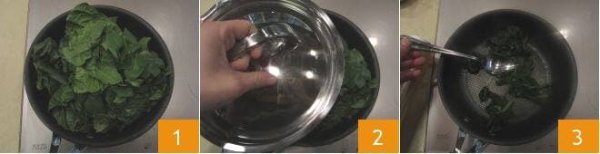Para realizar los spätzle de espinacas con speck y nata, lo primero que tenéis que hacer es lavar las hojas de espinacas y cocerlas en una sartén a fuego moderado con la tapa (1-2) hasta que estén bien marchitas 3.