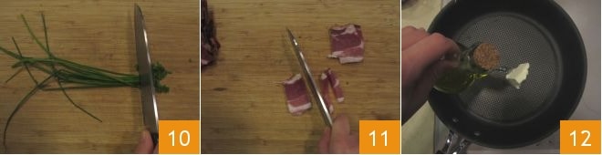 Ocupáos del condimento: picad con un cuchillo el cebollino 10 y cortad en tiras el speck 11. En una sartén, calentad la mantequilla y el aceite 12.