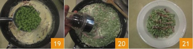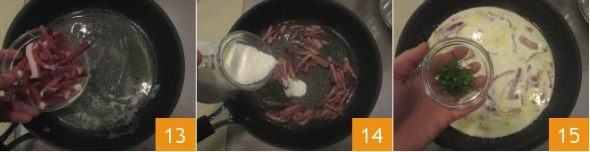 Añadid el speck 13 y dejadlo freír durante 2-3 minutos o hasta que esté crujiente. En este punto, verted la nata 14, el cebollino 15, ajustad de sal y pimienta y dejad espesar a fuego moderado para hacer que el condimento sea cremoso.
