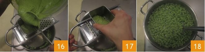 Todo está listo para cocer los spätzle: poned al fuego una olla llena de agua salada y llevadla a ebullición, luego colocad el Spätzlehobel sobre la olla y verted en el espacio correspondiente la mezcla 16, moviendo el utensilio hacia adelante y hacia atrás para que la masa caiga a través de los agujeros 17. Una vez en contacto con el agua hirviendo, los spätzle se cocerán en pocos instantes. Cuando los spätzle empiecen a aflorar en la superficie 18,