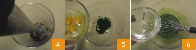 Transferid las espinacas a un vaso y trituradlas con la batidora de mano 4 hasta obtener una mezcla cremosa. A continuación, añadid los huevos enteros 5 y una pizca de sal. Mezclad con una batidora para amalgamar, luego verted el agua 6