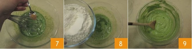 y sazonad con la nuez moscada 7. En este punto, verted gradualmente la harina 8 y mezclad con una cuchara para incorporarla a la mezcla, teniendo cuidado de no formar grumos. Reservad la masa de los spätzle 9.