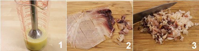 Para preparar las spianadas, empieza con la citronette: exprime el limón y viértelo en un recipiente alto y estrecho, añade el aceite, la sal y la pimienta y con la ayuda de una batidora de inmersión mezcla bien la salsa para obtener tu citronette. Luego, ocupa del pescado: coloca en una tabla las lonchas de pez espada ahumado y córtalas con un cuchillo para obtener un tartar.