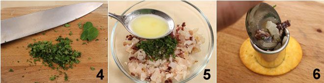 Pica las hojas de menta y únelas al pez espada. Rocía el tartar con la citronette y mezcla bien. Ahora puedes componer tus aperitivos: toma un pequeño cortapastas o un molde redondo para galletas de aproximadamente 3 cm de diámetro, colócalo en el centro de la spianada y vierte el tartar presionando con una cuchara para que se compacte bien manteniendo la forma. Retira con cuidado el molde y obtendrás las mini tartares. Decora con pequeñas hojas de menta y sirve.