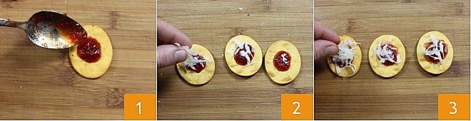 Para preparar la receta de las spianate picantes, colocad sobre cada spianata al tomate aproximadamente 2 g de mermelada de pimientos picantes 1; rallad gruesamente el provolone picante y poned un montoncito sobre la mermelada 2. Terminad con una pizca de pimentón picante en la superficie 3. Et voilà... ¡las spianate picantes están listas para avivar vuestro buffet!