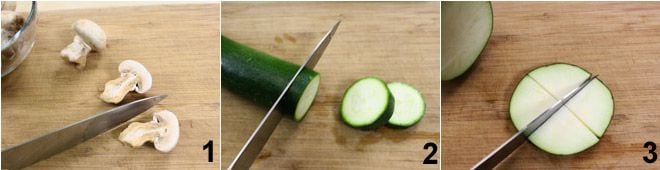 Para preparar las brochetas de verduras, empieza por limpiar los champiñones y cortarlos por la mitad 1, lava todas las verduras y corta en rodajas de 1 cm el calabacín 2, corta en rodajas la berenjena y divide en cuartos cada rodaja 3, siempre con un grosor de 1 cm ,