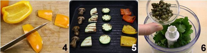 corta finalmente también los pimientos obteniendo rectángulos de las proporciones de las otras verduras 4. Unta con aceite una parrilla grande y cocina las verduras a fuego vivo 5. Mientras tanto, prepara la salsa poniendo en el mixer las hojas de perejil, las alcaparras 6, el aceite,