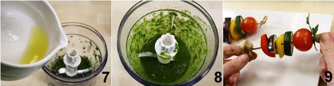el zumo de limón 7 y el ajo, tritura todos los ingredientes hasta obtener una mezcla cremosa 8. Comienza ahora a componer las brochetas insertando una hoja de perejil y luego el resto de los componentes alternándolos: los tomates, los calabacines, los pimientos, las berenjenas, los champiñones y los bocados de mozzarella. Coloca las brochetas en un plato de servir y acompáñalas con la salsa de perejil y alcaparras.