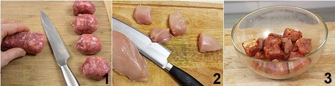 Para preparar las brochetas vivaces a la cerveza, comienza preparando todos los ingredientes que necesitas para formar las brochetas. Divide la salchicha en 8 trozos 1 para obtener más o menos el mismo tamaño de la carne (aproximadamente 45 gr para salchichas bastante gruesas tipo mantovana). Corta 8 cubos de pollo de unos 35 gr cada uno 2 y 16 cubos de carne de cerdo del mismo tamaño. Coloca solo los trozos de cerdo en un cuenco y espolvoréalos con el pimentón para que se adhiera bien a la carne 3.