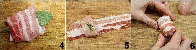 Corta la panceta de cerdo para obtener 8 piezas que puedan doblarse como un libro (aproximadamente 20 gr) e inserta en medio una hoja de salvia 4. Toma un trozo de carne de pollo, coloca encima una ramita de romero 5 y envuélvelo completamente con una loncha de panceta ahumada 6: procede así con los demás cubos de carne de pollo.