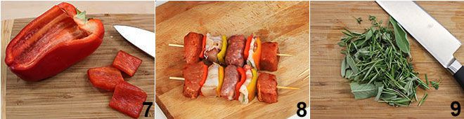 Lava, seca, elimina las semillas y los filamentos internos, luego corta los pimientos en tiras obteniendo de ellos 16 cuadrados rojos 7 y 16 amarillos (o verdes) con un lado de aproximadamente 3,5 cm. Toma unos palitos de madera (o de acero) para brocheta y comienza a insertar en ellos un trozo de carne de cerdo, luego un cuadrado de pimiento rojo, la carne de pollo envuelta en panceta, un cuadrado de pimiento amarillo (o verde), la salchicha, un cuadrado de pimiento rojo, la panceta doblada con la salvia, otra tira de pimiento amarillo y finalmente un trozo de carne de cerdo 8. Ahora solo te queda hacer otros 7 idénticos con los ingredientes restantes a tu disposición. Pica las hierbas aromáticas 9