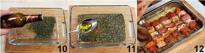 y prepara ahora la marinada para las brochetas: en un cuenco, coloca el picado de romero y salvia, vierte la cerveza roja 10, añade el aceite 11, el jugo y la ralladura de limón, sal y pimienta. Mezcla bien, vierte el líquido sobre las brochetas 12 y deja marinar durante al menos media hora.