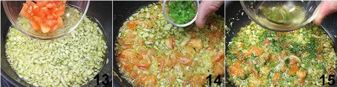 Mientras tanto, prepara la salsa de cerveza: pica la chalota, corta en pequeños trocitos el tomate, el chile verde y trocea el romero y el tomillo. En una sartén, sofríe la chalota con el aceite de oliva virgen extra, añade los tomates 13 y uno a uno todos los ingredientes: el chile verde 14, las hojas de albahaca, el romero y el tomillo picados, el vinagre de arroz (o de manzana) 15,