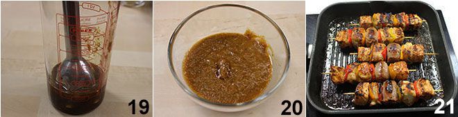 En este punto, transfiere la mezcla a un vaso y mezcla todo con una batidora de mano 19. Vuelve a poner la salsa a fuego lento hasta que obtengas una salsa muy espesa 20, que ajustarás eventualmente de sal y reservarás. Retira las brochetas de la marinada y cocínalas en una parrilla o plancha hasta el punto de cocción deseado, aproximadamente 20 minutos 21, pincelándolas durante la cocción con la marinada sobrante. Sirve las brochetas vivaces regadas con la salsa de cerveza obtenida o llevando esta última en una salsera y dejando que tus comensales la utilicen a su gusto!
